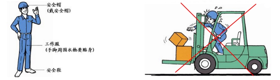 When driving a vehicle, you must wear work clothes, protective shoes, and hard hats.
