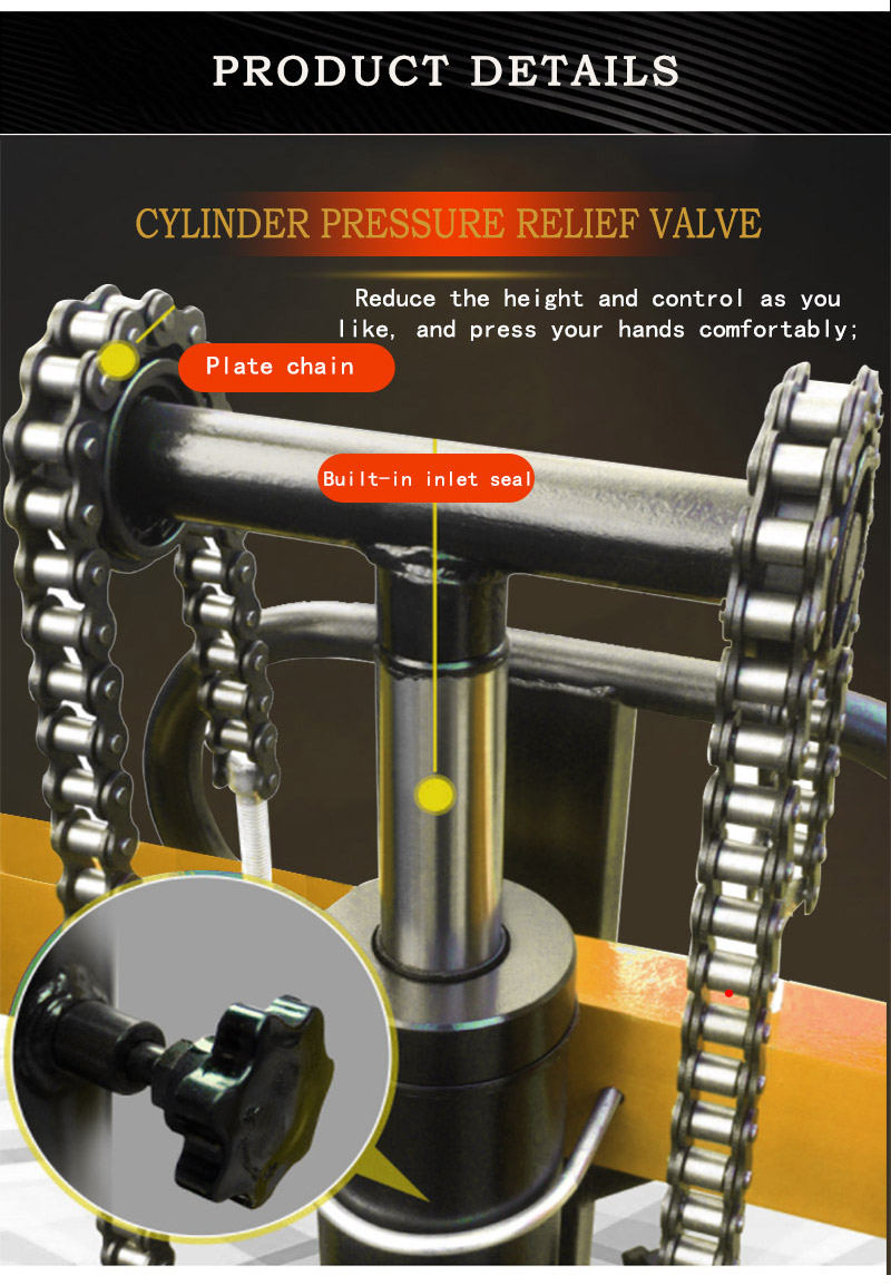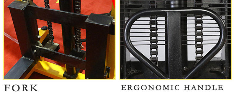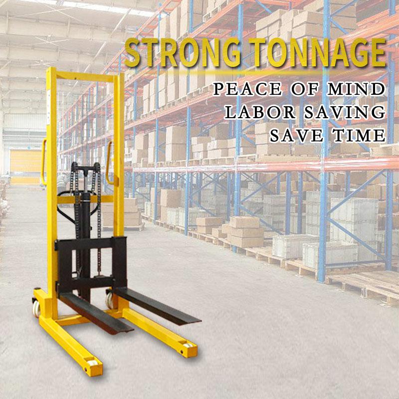 Manual hydraulic stacker uses double lifting chains for a smoother load. Manual hydraulic stacker can adjust the fork and adjust the width of the fork to meet various needs. Manual hydraulic stacker adopts high-strength pure steel guide wheel, which is wear-resistant and pressure-resistant.